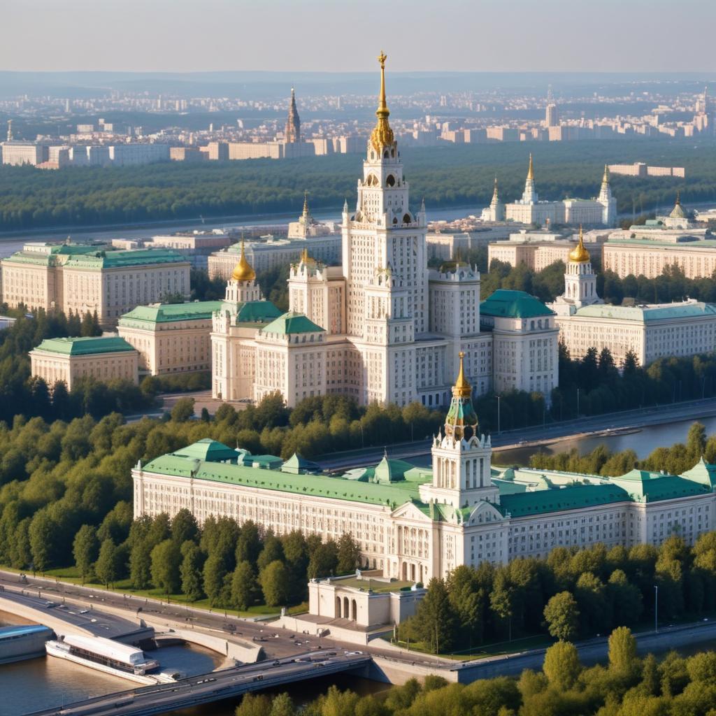 Архитектура главного здания МГУ, расположенного на Воробьёвых горах, является ярким примером сталинского неоклассицизма. Этот монументальный комплекс был построен в конце 1940-х — начале 1950-х годов и до сих пор считается одним из самых узнаваемых и впечатляющих сооружений Москвы. Его 36-этажная высотка украшена шпилем с символическим гербом СССР, что подчеркивает исторический контекст времени строительства. Здание не только архитектурный символ, но и важный ориентир городской панорамы.
