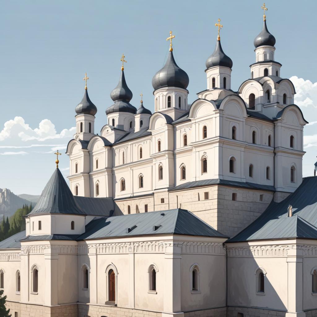 Архитектура монастыря связана с традициями древнерусского зодчества, прослеживая влияние как византийских, так и местных русских строительных техник. Главные здания монастыря, такие как собор Успения Пресвятой Богородицы, выполнены в строгих и гармоничных формах, характерных для религиозных построек того времени. Эти сооружения обрели свой неповторимый стиль благодаря использованию крупных каменных блоков, массивных сводов и куполов, которые олицетворяют связь между земным и небесным миром.