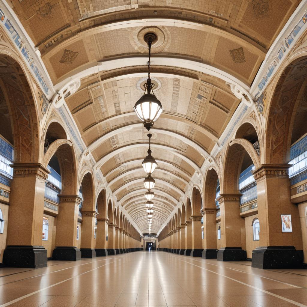 Особое внимание в дизайне станции уделено архитектурным деталям и художественным элементам. Стены и потолок украшают изящные мозаики, выполненные в стиле авангардного искусства, которые не только служат декоративной функцией, но и отражают идею прогресса и коллективного труда. Эти мозаики создают визуальный эффект простора и света, играя с объемом и формой пространства.